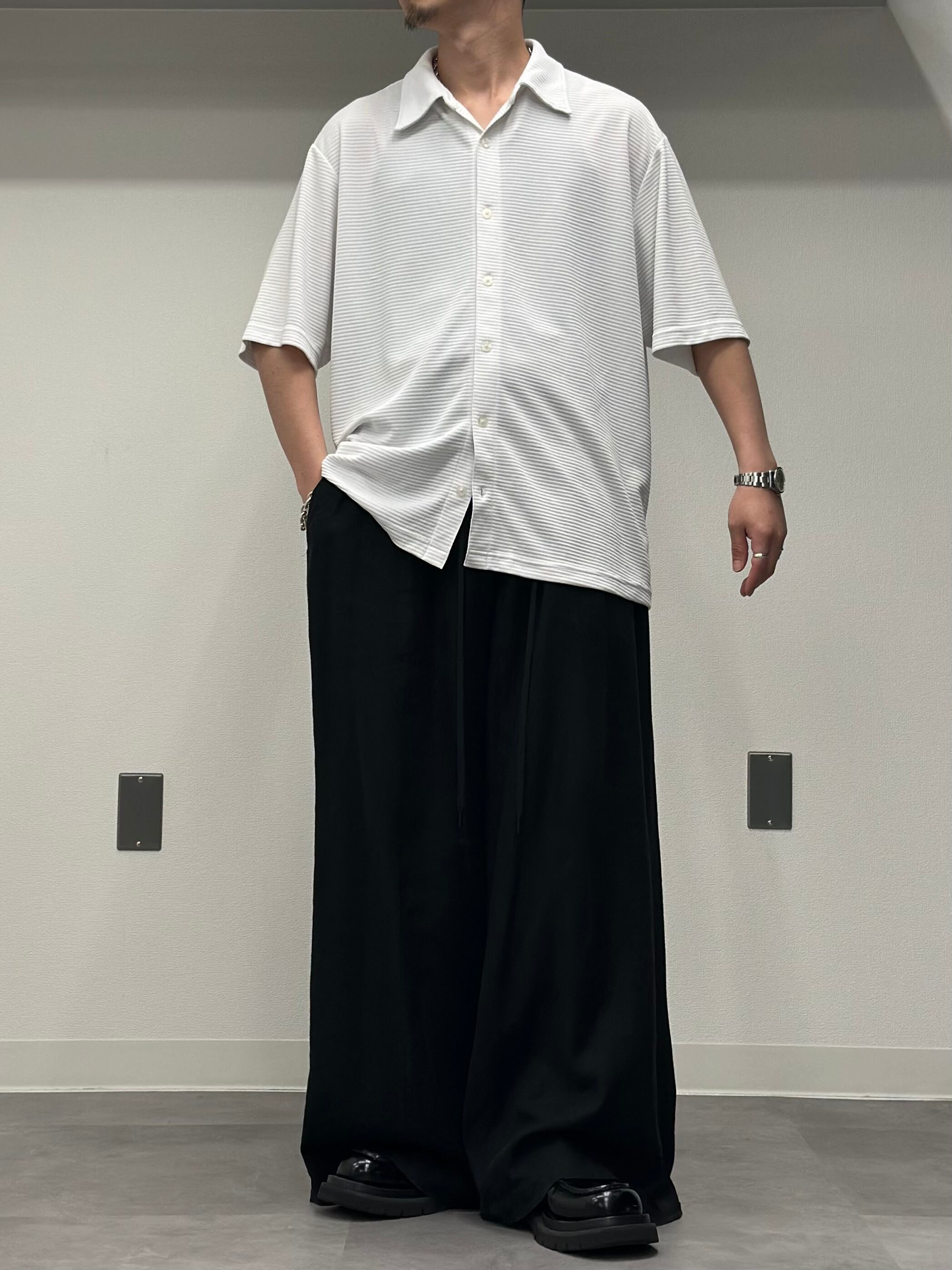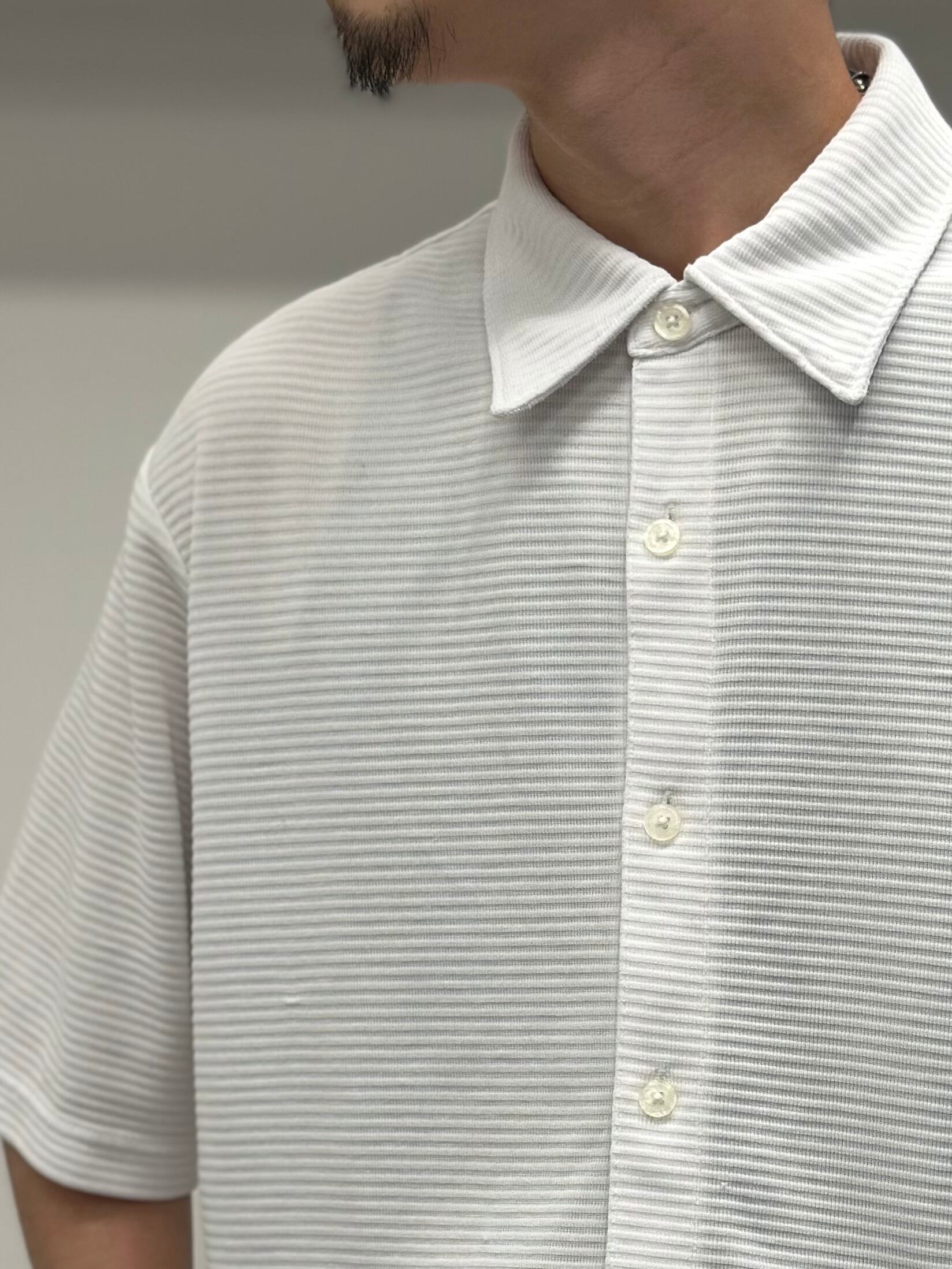 一見シンプルな白シャツですが、よく見ると横畝の織りが入っていて細いパッチのボーダーの様なデザイン。