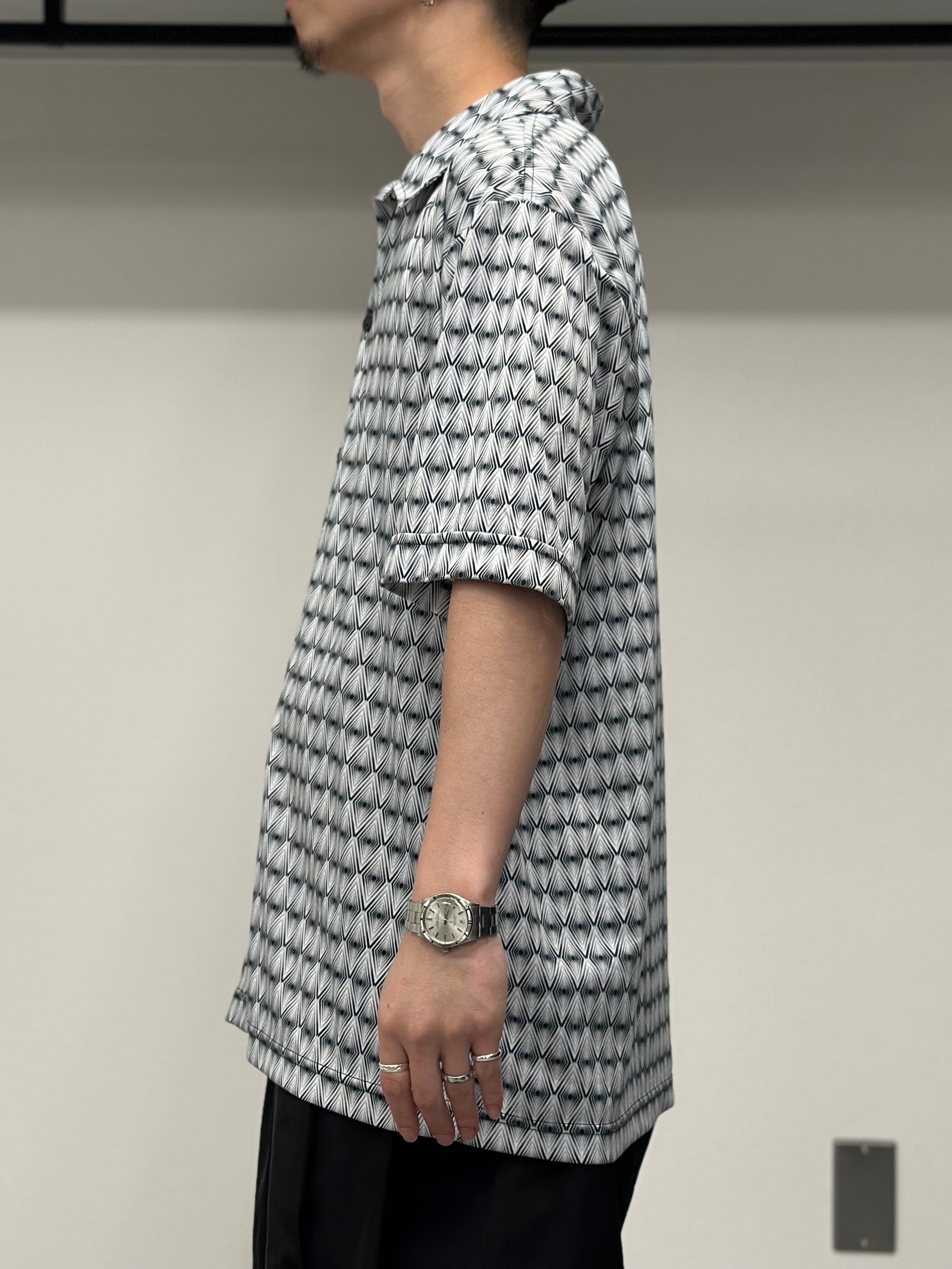 幾何学柄のプリントシャツ。