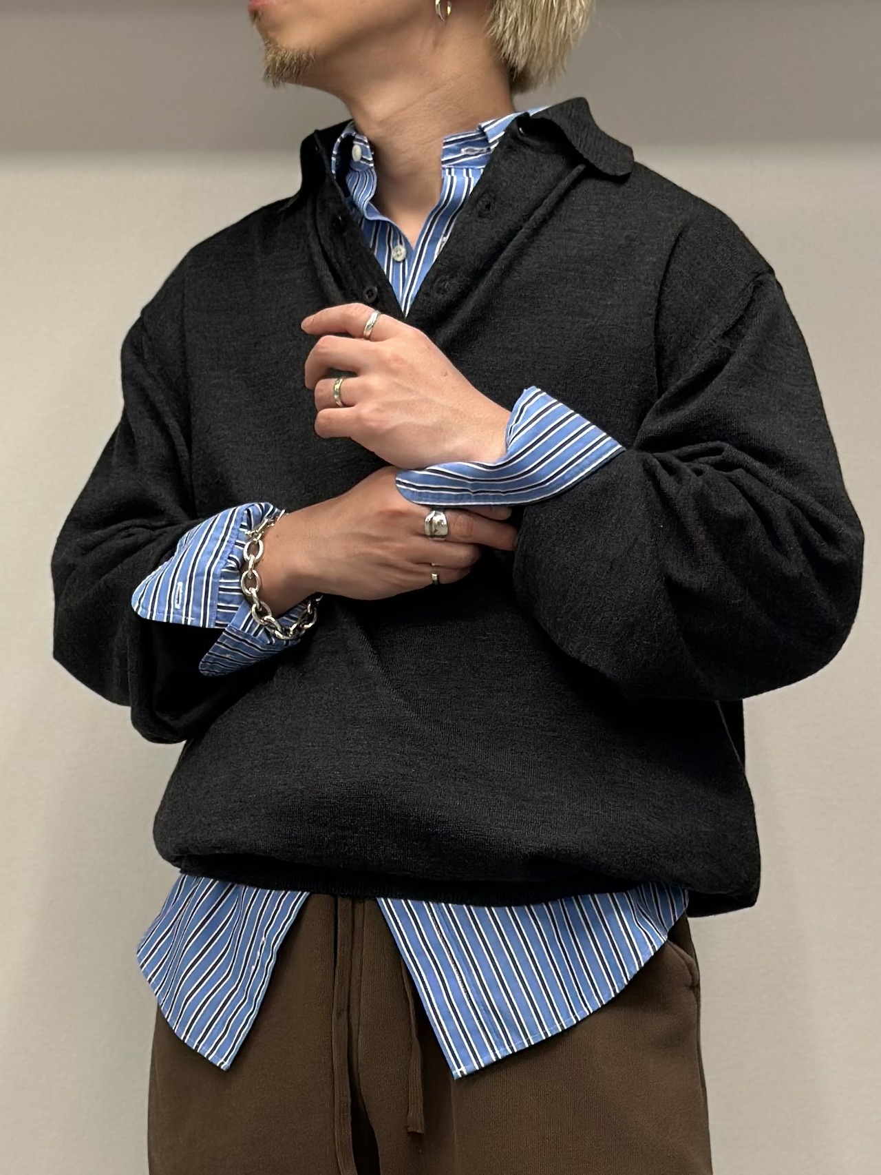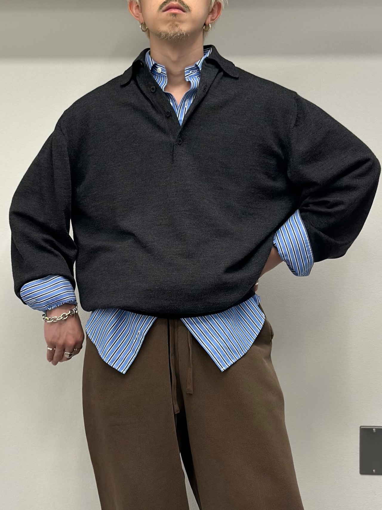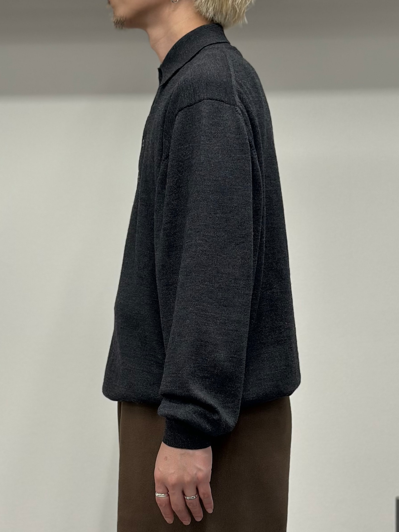 こちらは大人の漢のチャコールグレーカラーのニットポロシャツ。