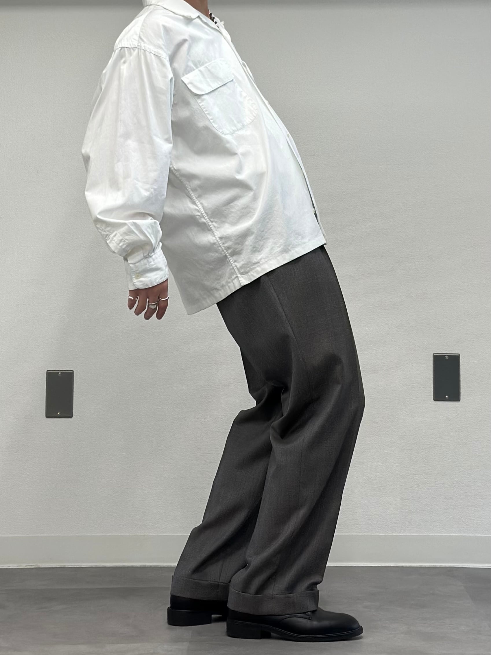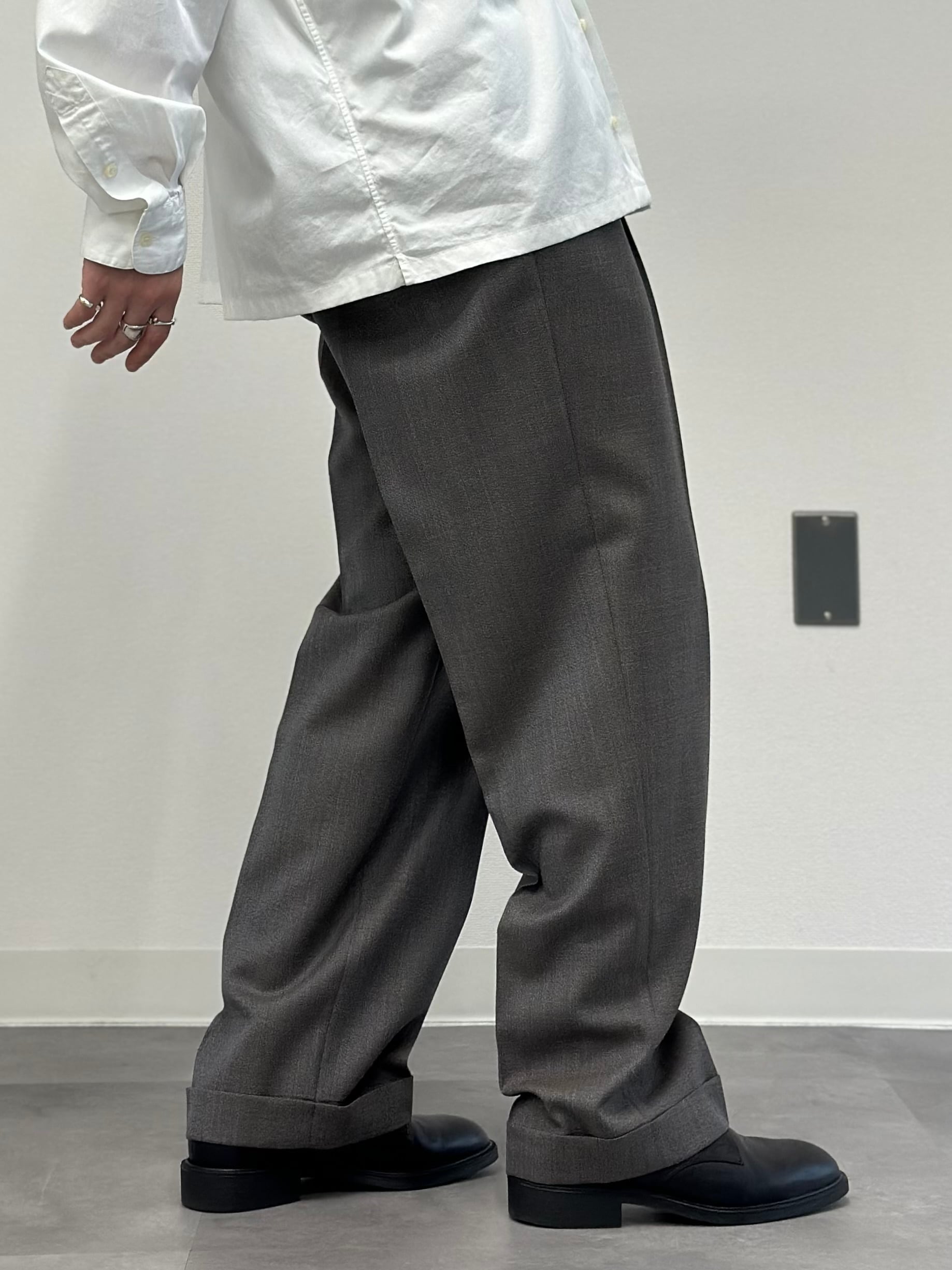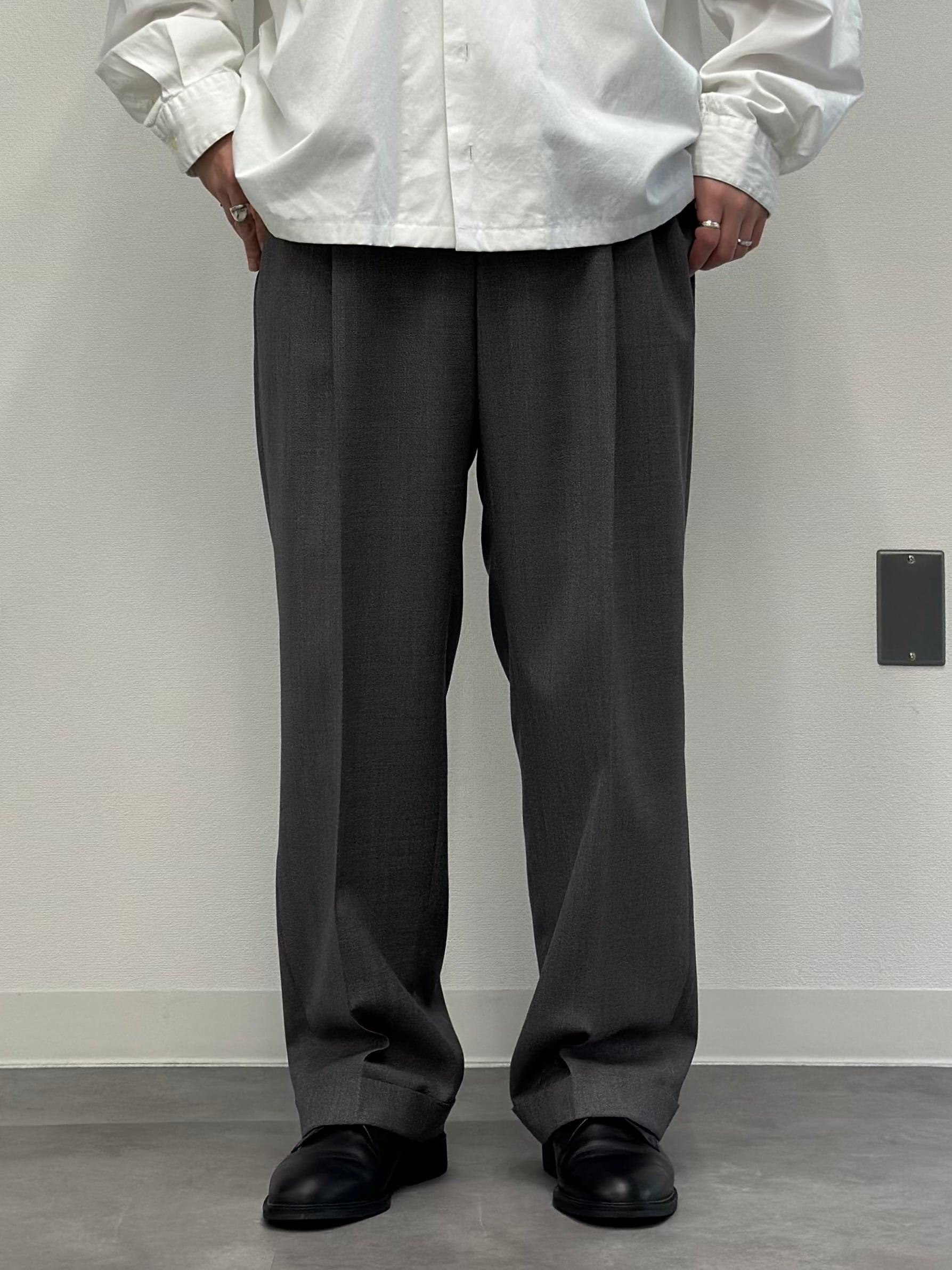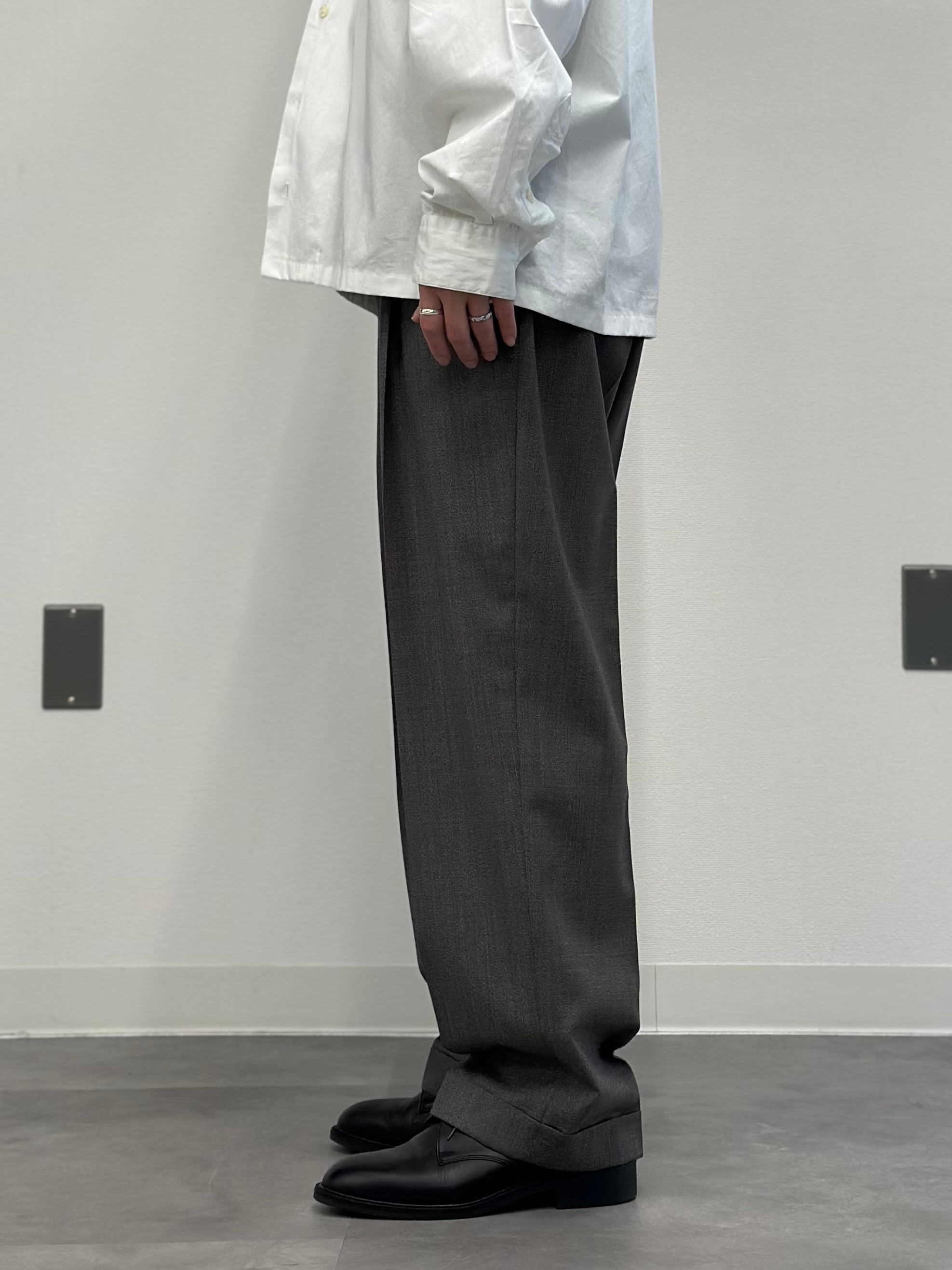 2タックの腿周り気持ちスッキリ目、ストンと落ちるほぼストレートの極微テーパードシルエット。