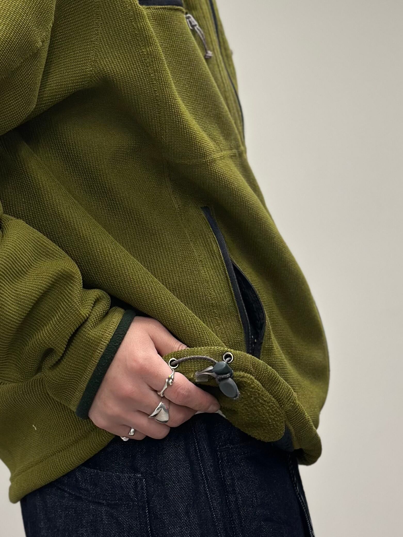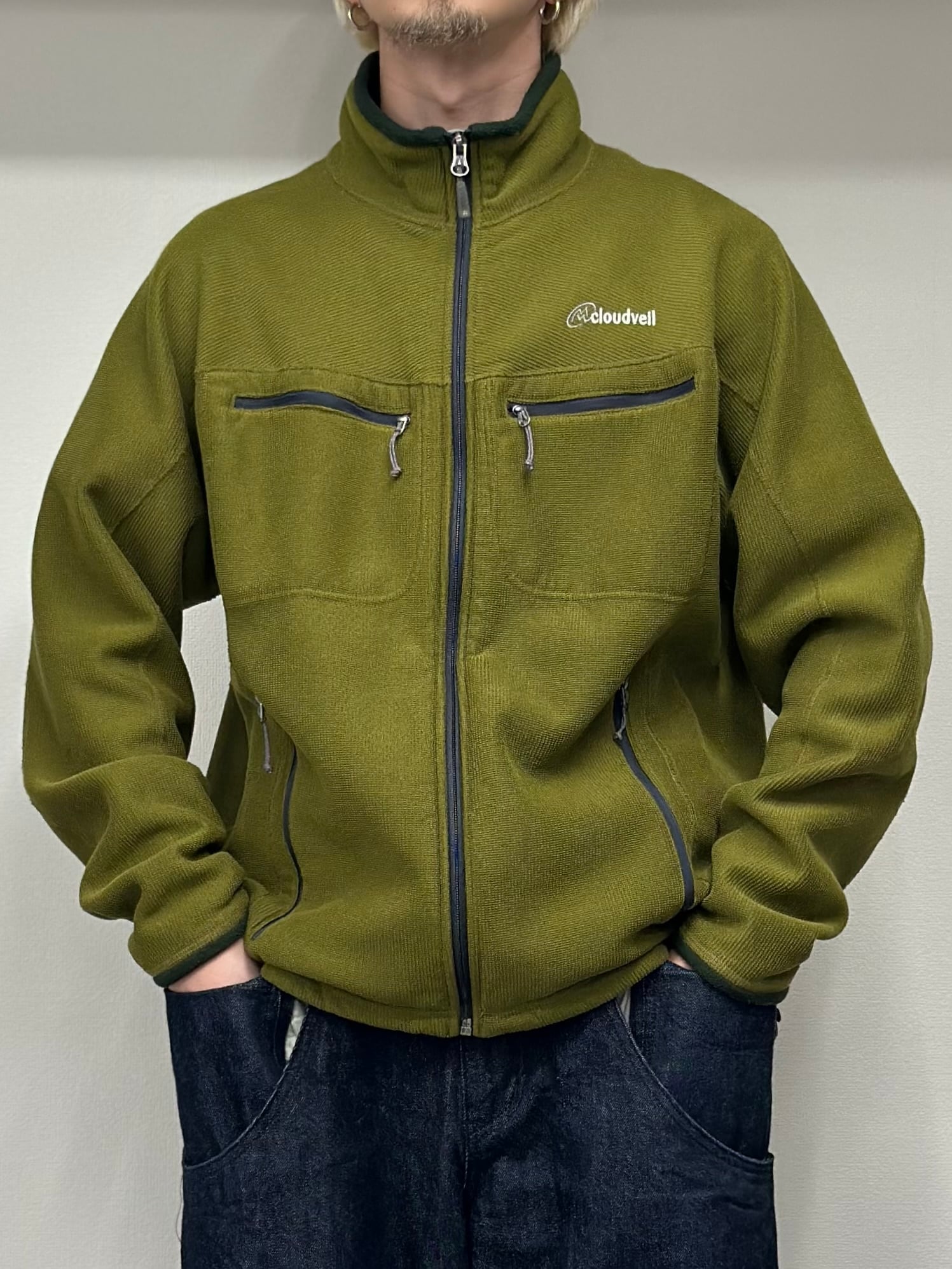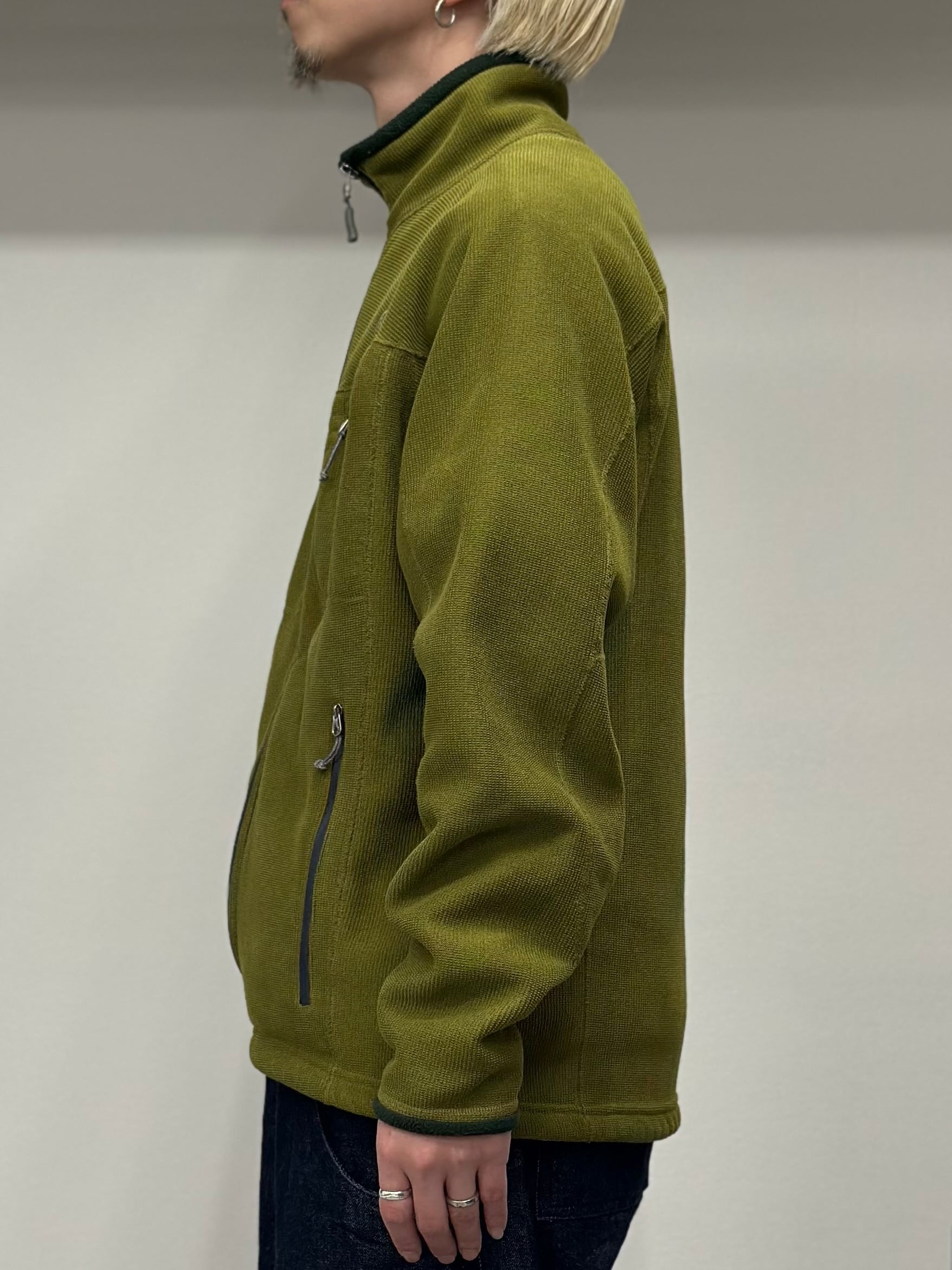 こちらはオールポリエステルファブリックで表のシェルはザラっと凹凸感があるニット織り、裏地はフリース地のジップアップジャケット。