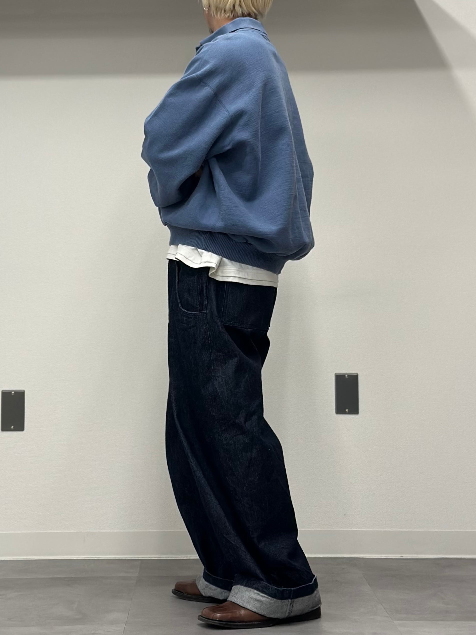 着丈はスッキリ目でリブはしっかり効いて溜まるシルエット。
