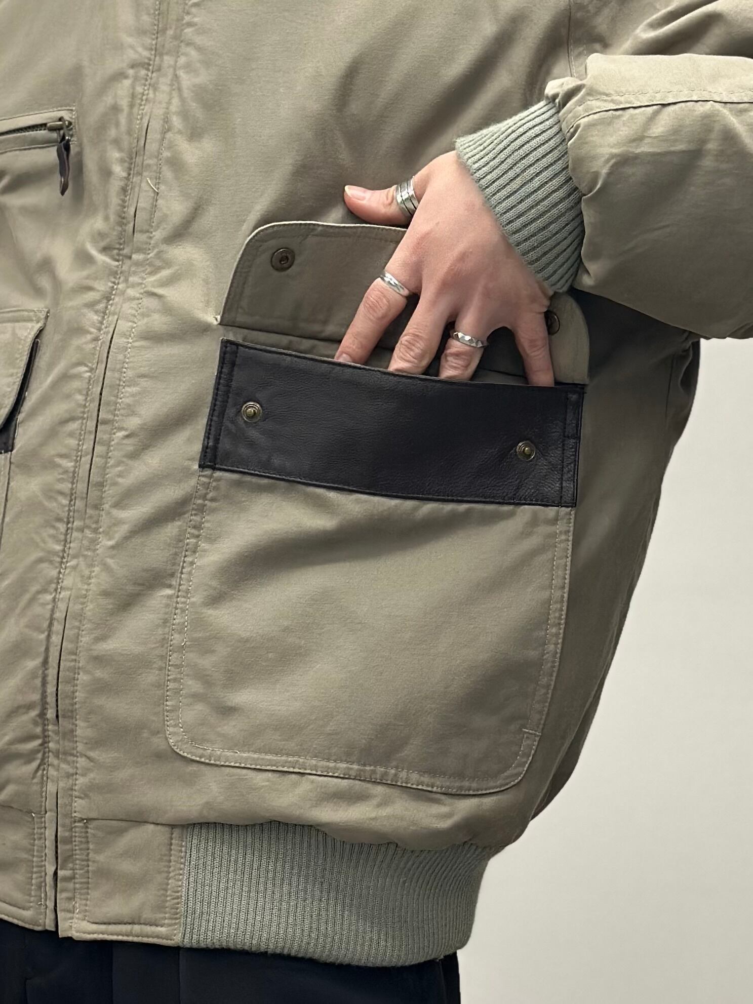 ジップの引き手やフラップの裏、エルボーパッチはダークブラウンのレザーを使用。