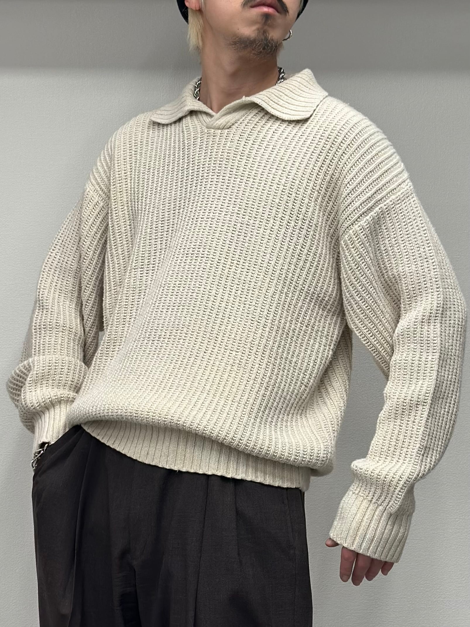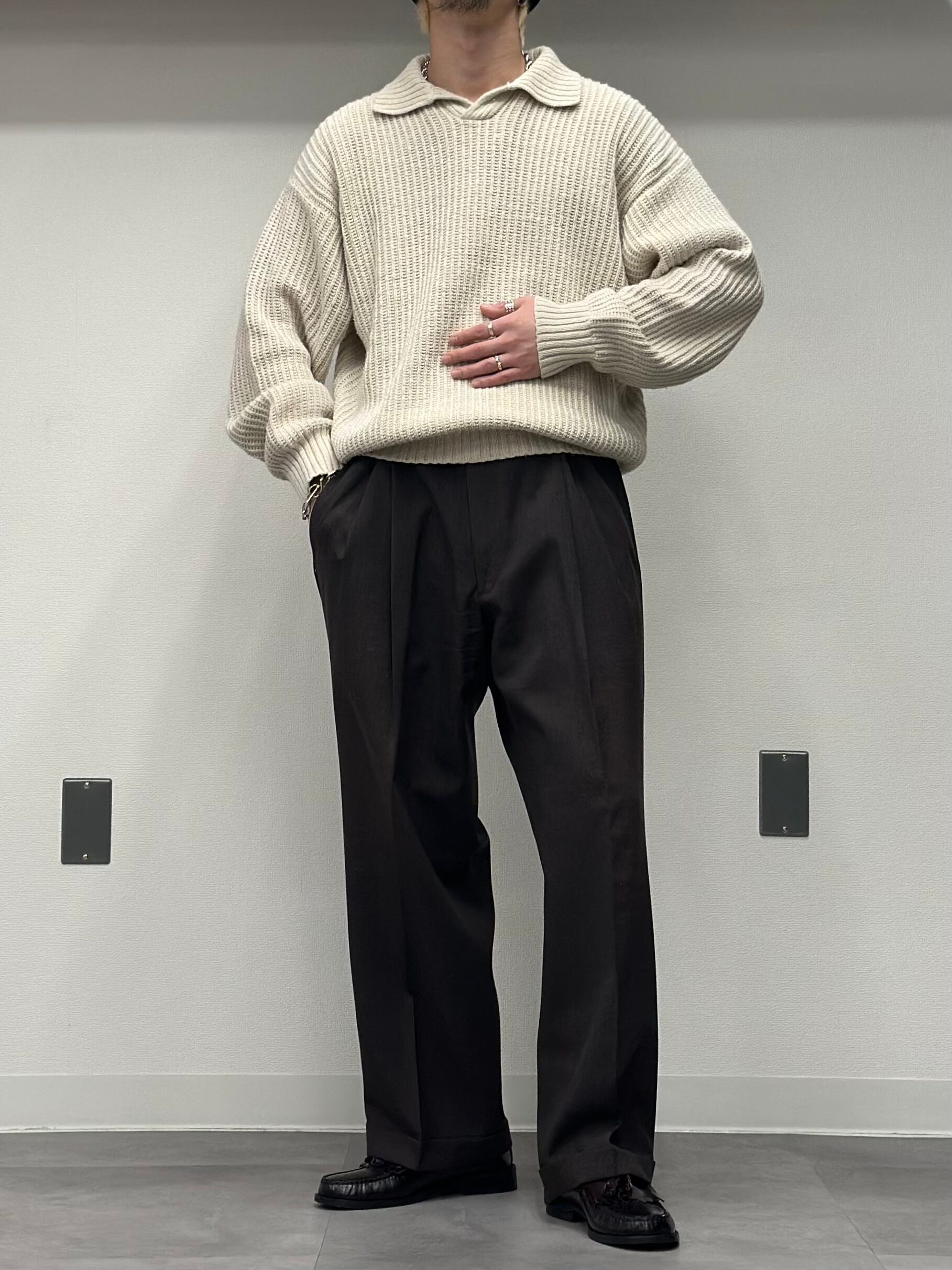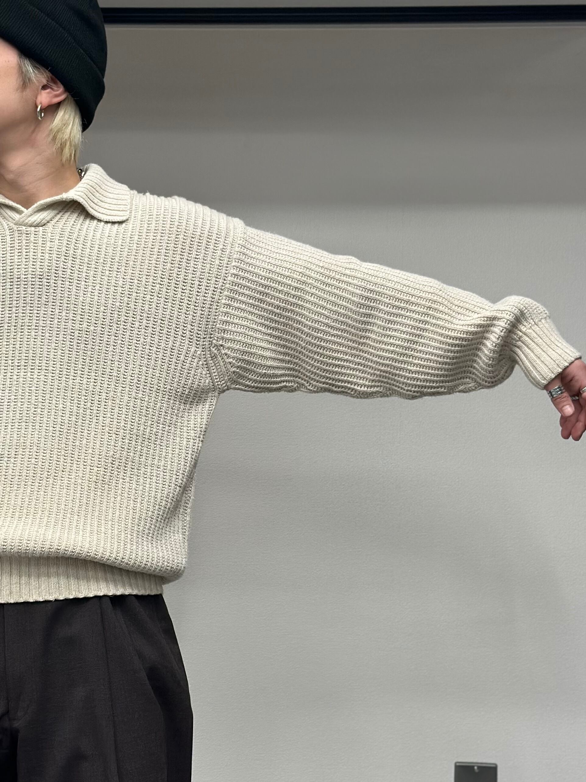 こちらは畦編みのニットポロシャツ。