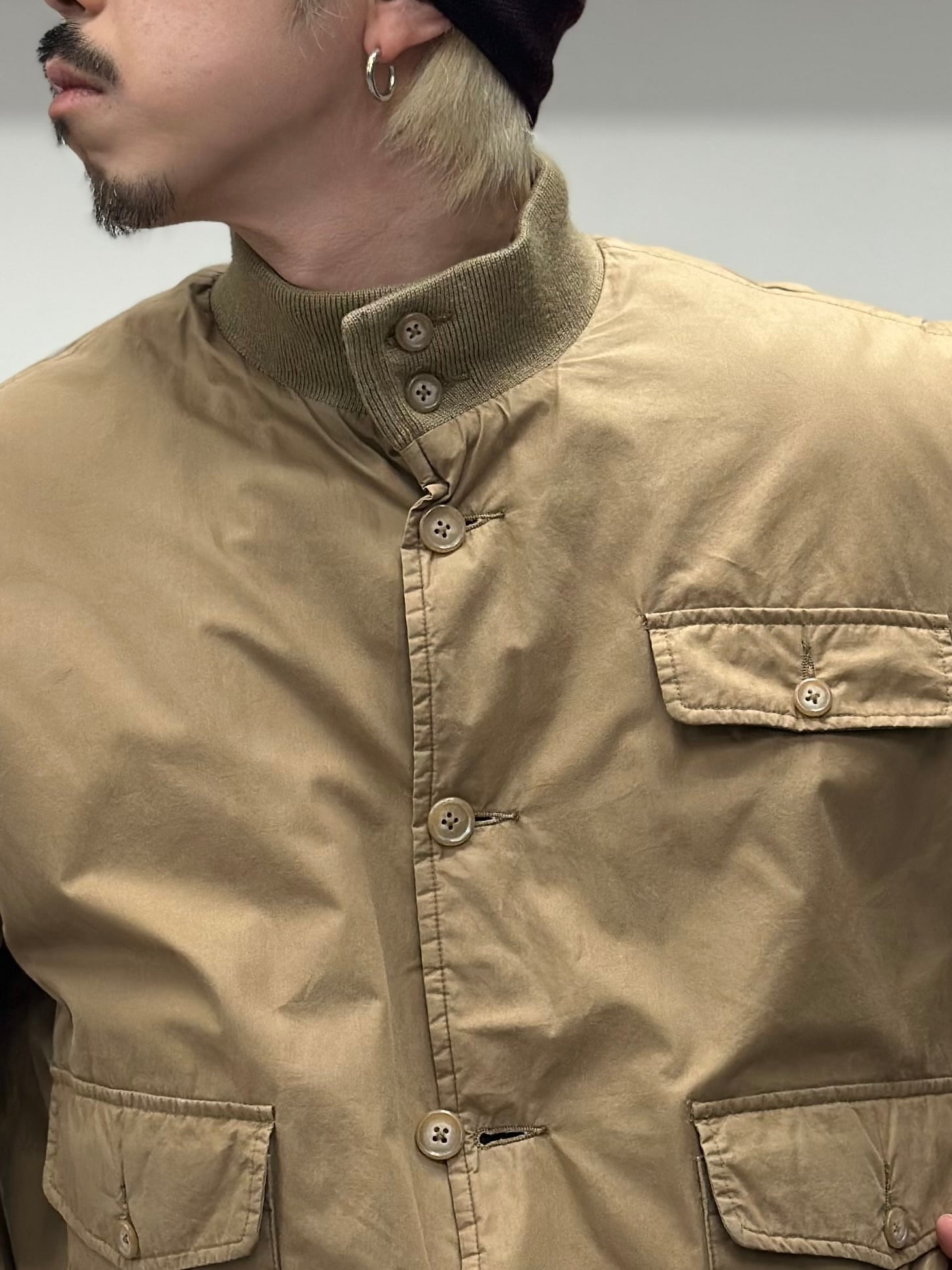 襟のリブはボタンを閉じると首にフィットして防寒性◎。