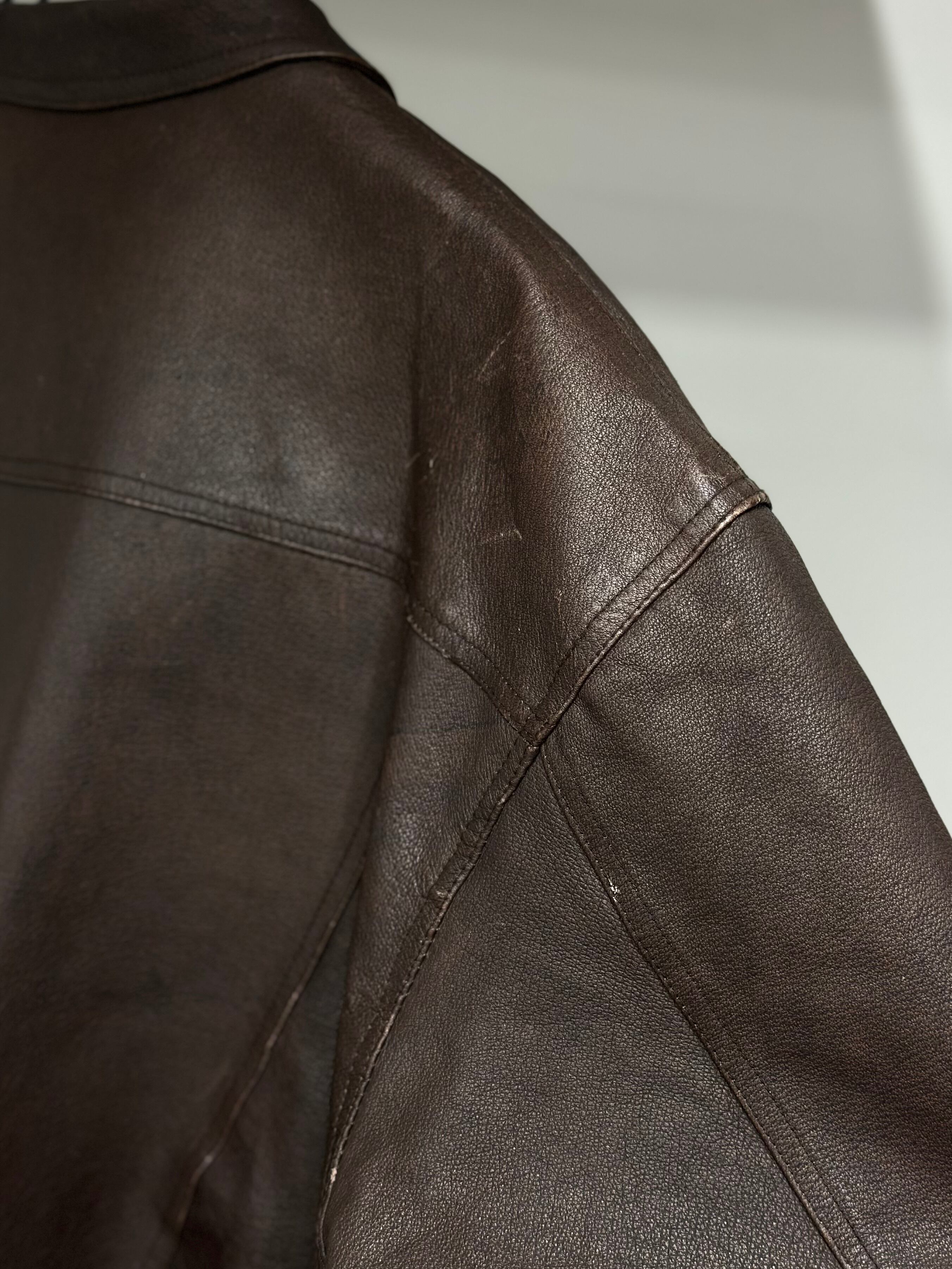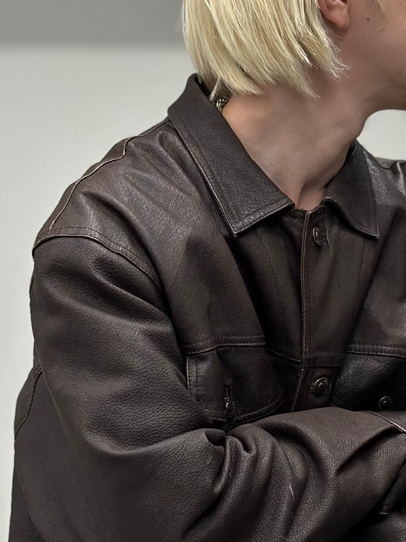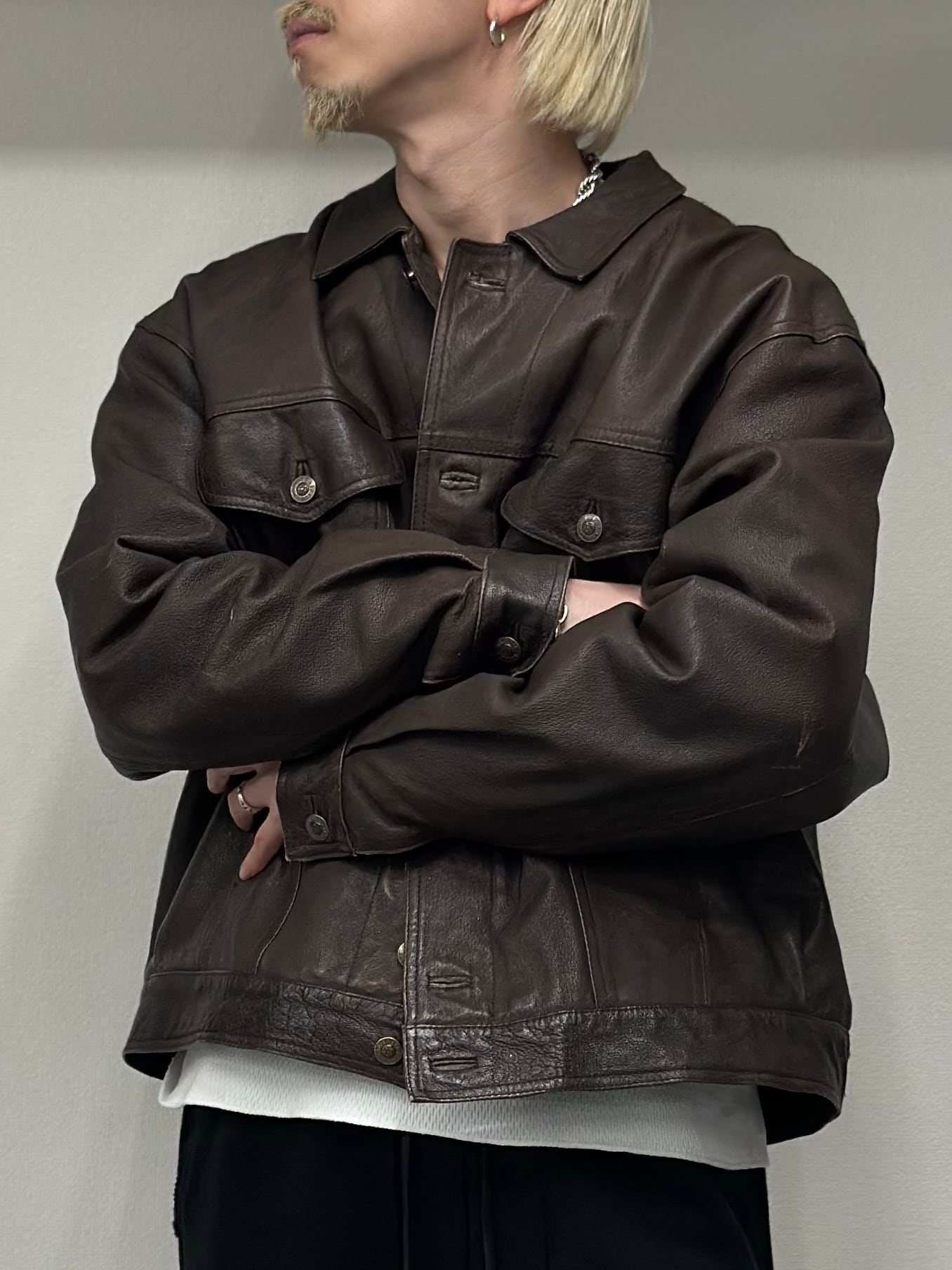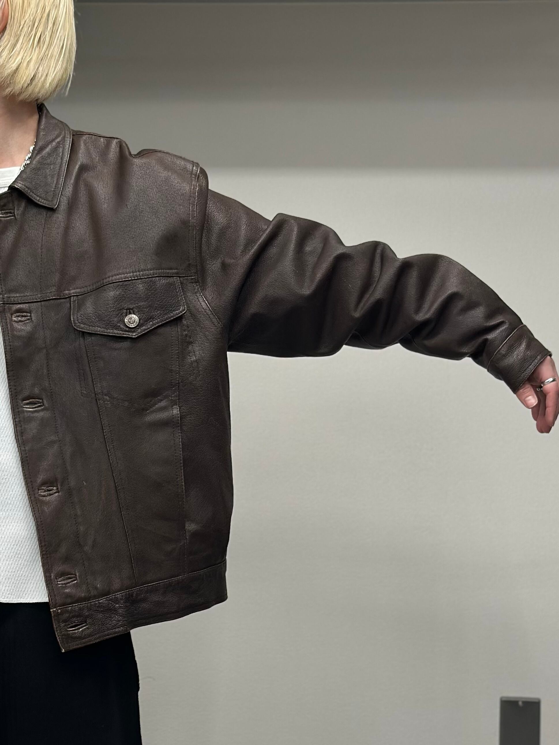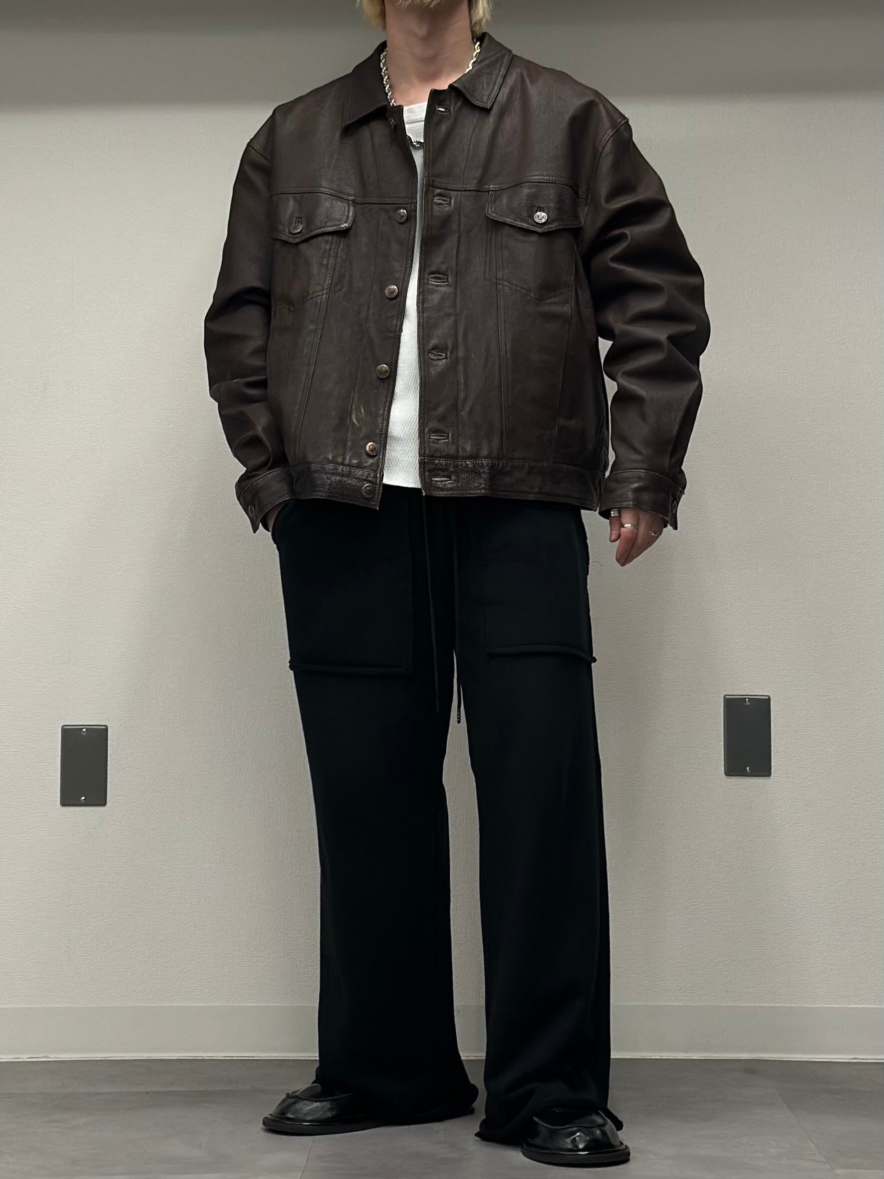 ダークブラウンレザーのトラッカージャケット。