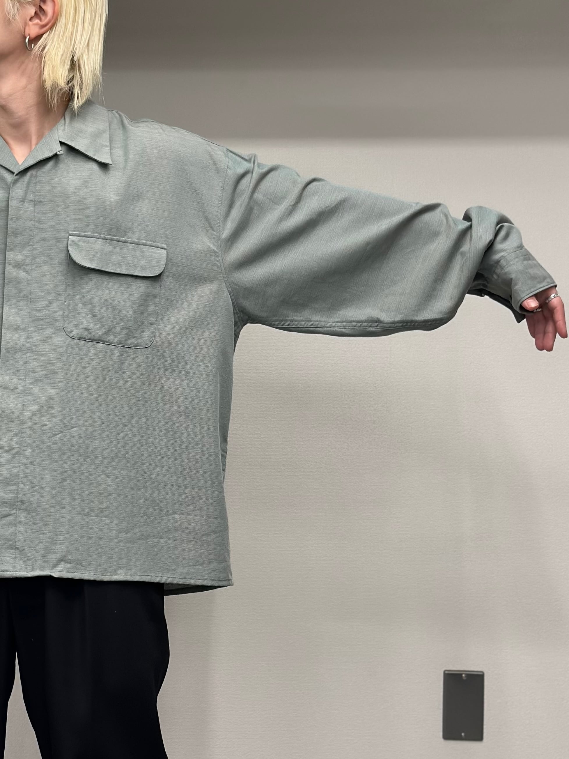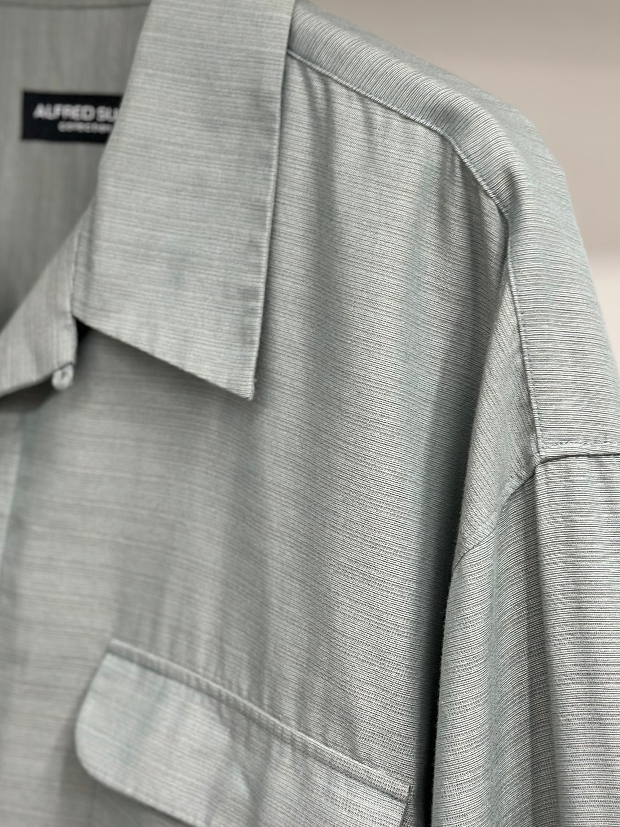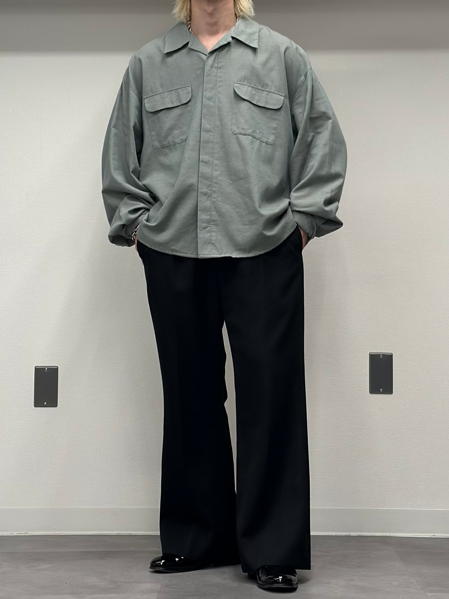 フラップ付きの胸ポケットに襟はオープンカラー。