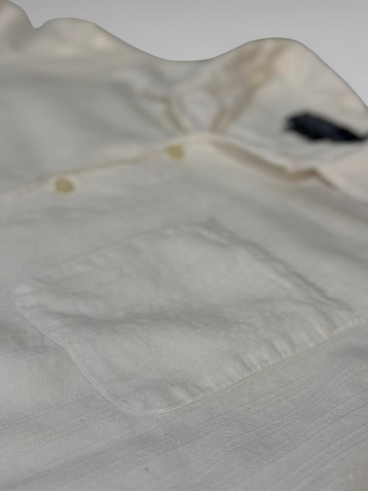 この織りも入ることがただの白シャツにならず一枚で着れる程よいデザイン性。